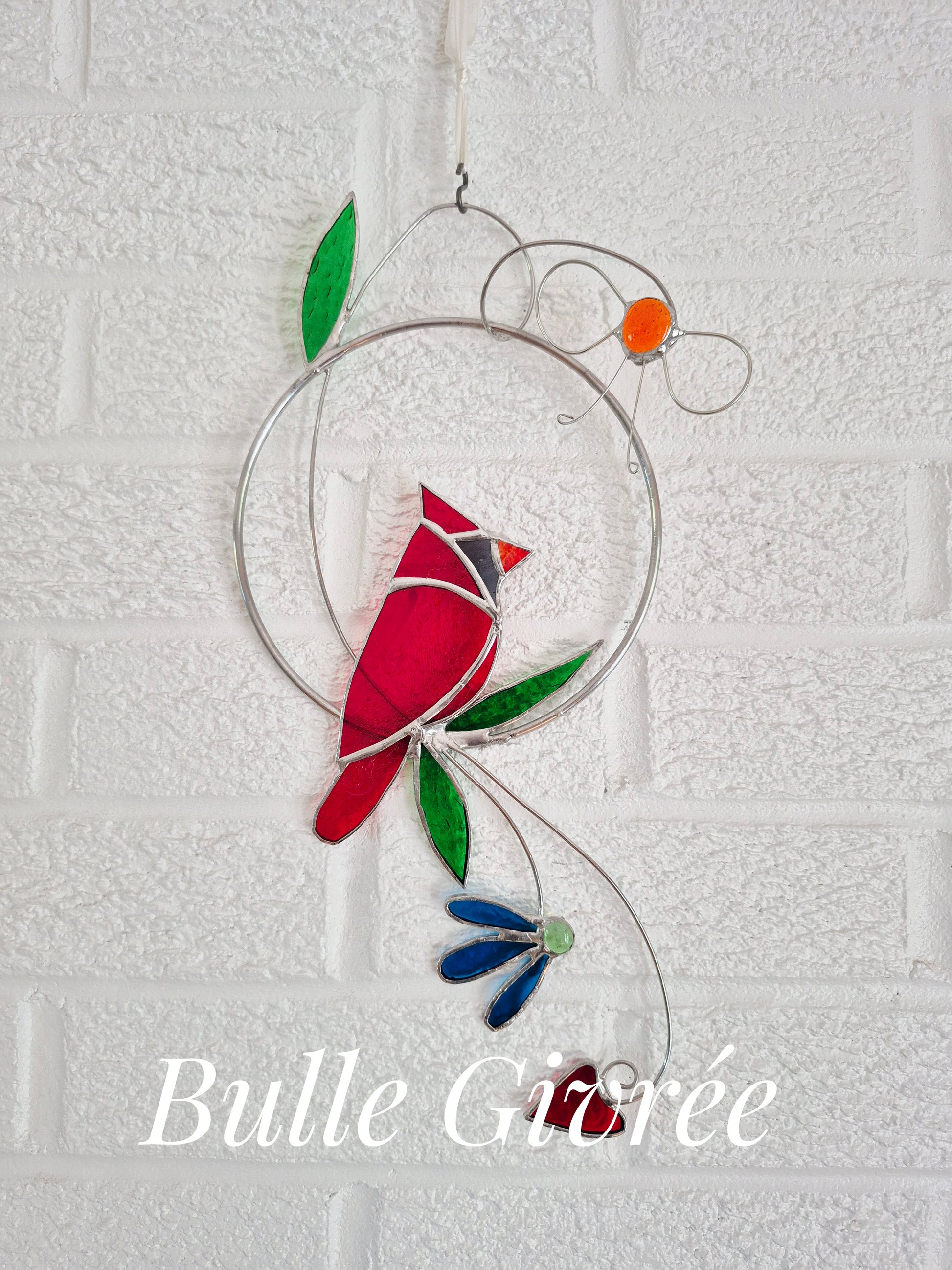 mobile capteur de lumière Cardinal rouge accompagné d'une fleur bleu , une bibite orange et d'un coeur en vitrail à suspendre a votre fenêtre.