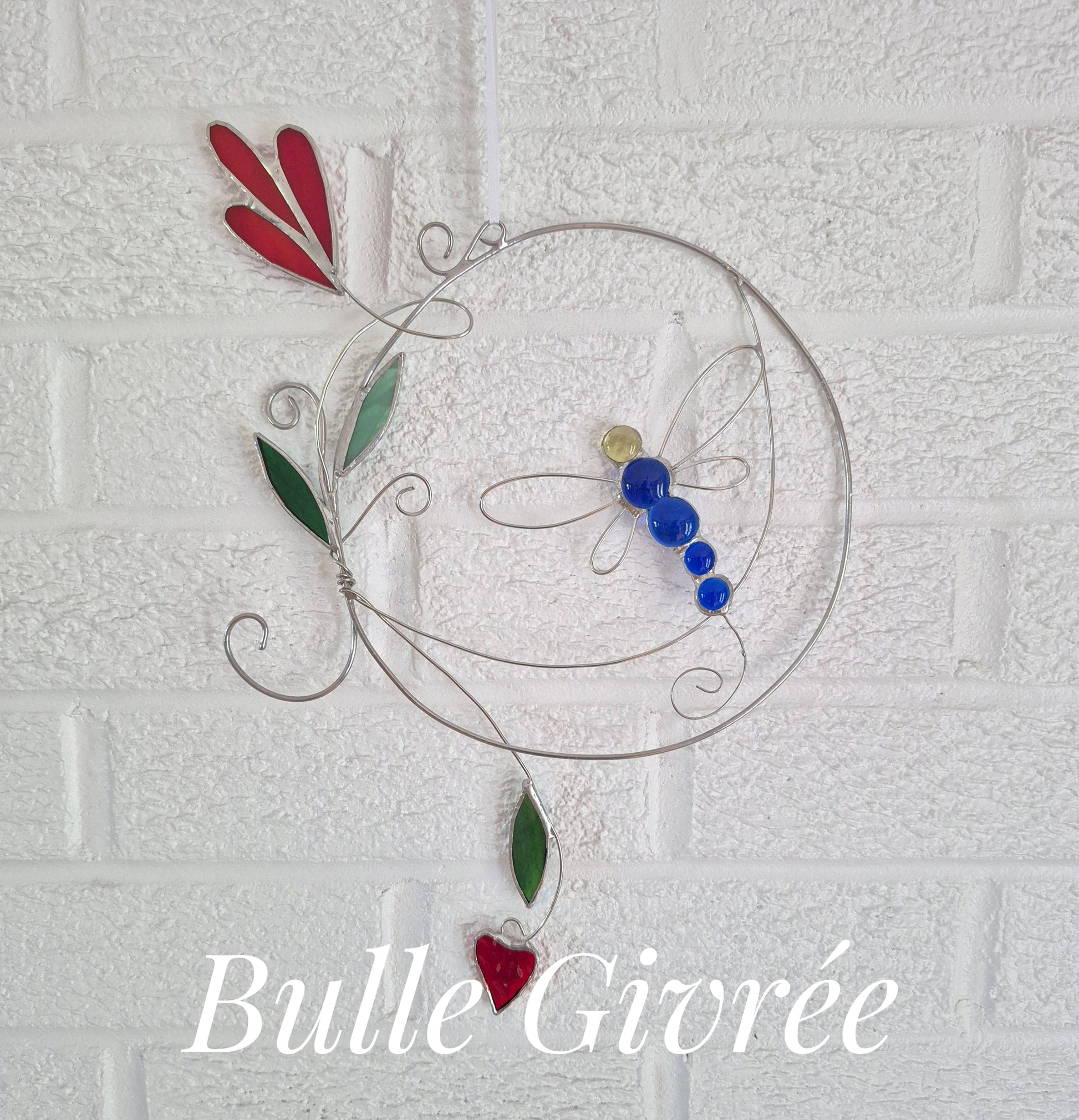 Délicate libellule en vitrail capte les rayons du soleil pour créer des reflets colorés uniques, enrichissant votre décor d'une ambiance apaisante et raffinée. Un choix parfait pour les amateurs d'art et de nature cherchant à allier beauté et lumière. accompagné d'une fleur rouge ,des feuilles vertes et un coeur rouge.