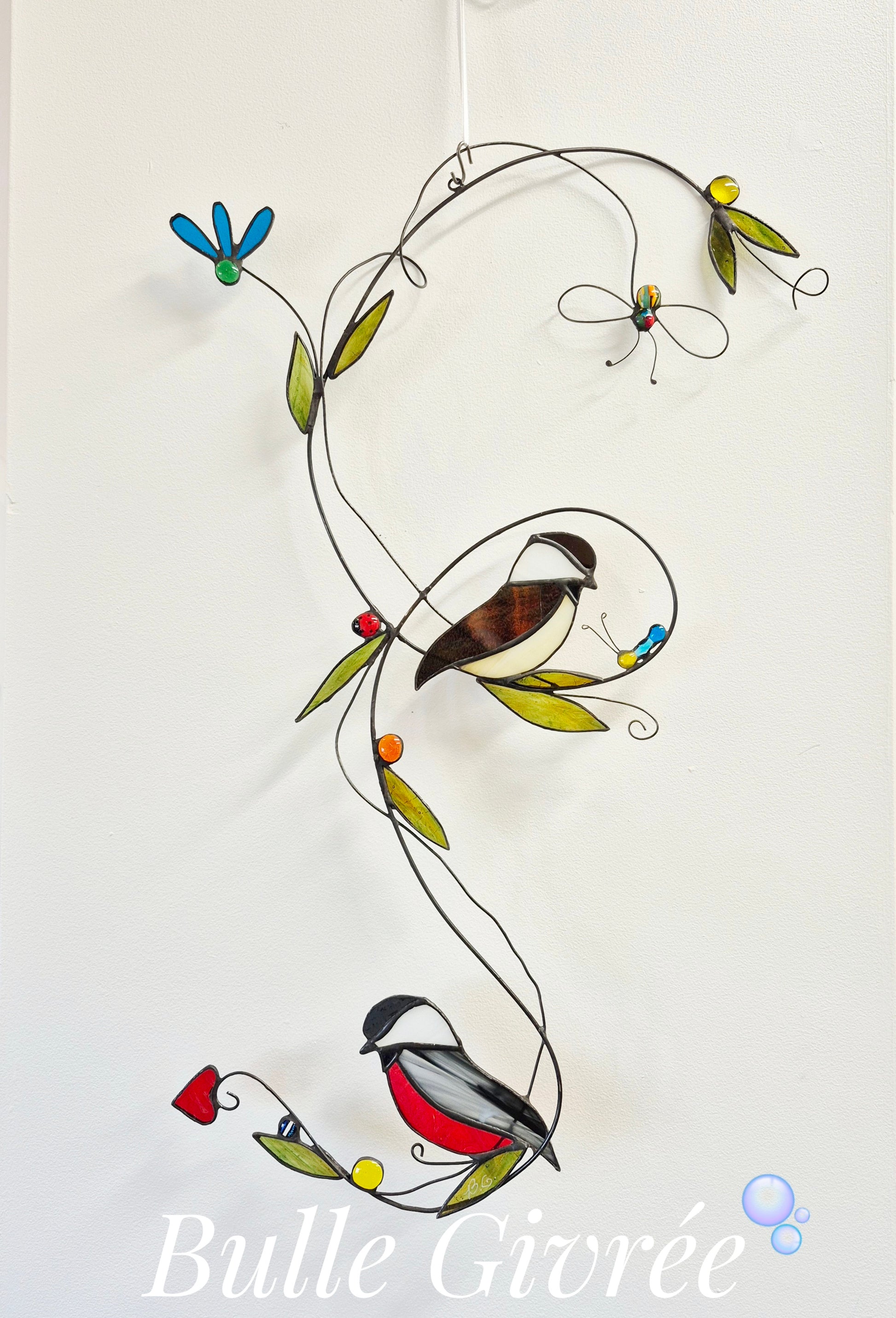Illuminez votre intérieur avec notre mobile Mésanges et ses amis en vitrail, mesurant 38 cm X 60 cm . Chaque détail est soigneusement travaillé pour capturer la délicatesse de ces oiseaux, ajoutant une touche de sérénité à votre espace. Suspendez le à votre fenêtre pour que les couleurs vives fusionnent avec la lumière naturelle, créant ainsi un effet visuel captivant.