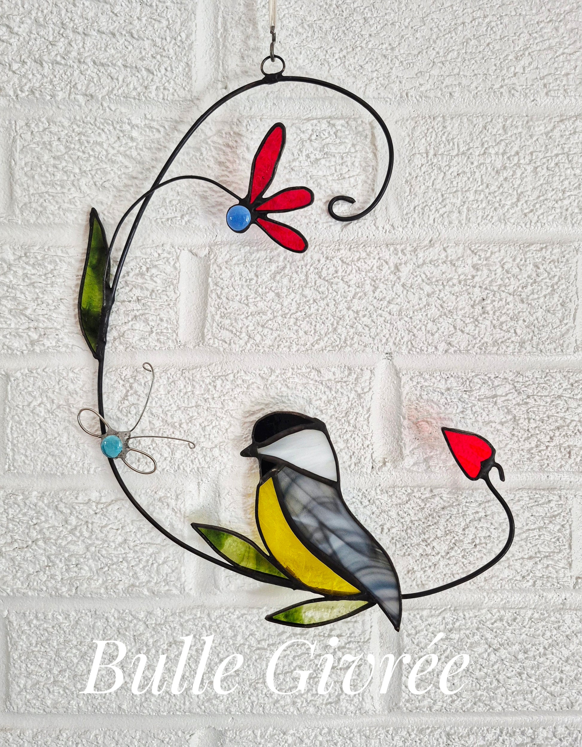 Sublimez votre intérieur avec notre mobile en vitrail représentant , une mésange jaune accompagné d'une bibite bleu accompagné d'une fleur rouge et un coeur, assemblé sur un fil de cuivre noir. Dimensions : 23 cm x 29 cm. Ce magnifique accroche-lumière capture la lumière naturelle, apportant une touche de chaleur et de couleur à votre décor. Parfait pour créer une ambiance lumineuse et poétique, ou pour offrir en cadeau aux amoureux de la nature.